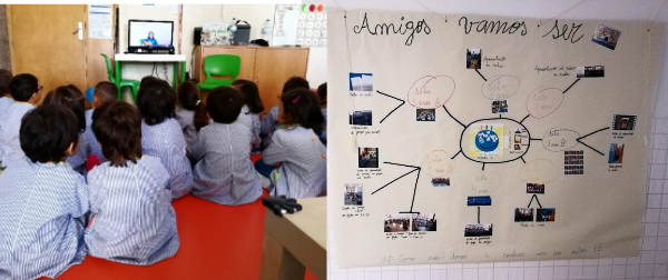 Depois de aprenderem a canção da amizade “ter amigos é tão bom” e escutarem uma história sobre os amigos, os grupos desenvolveram diferentes estratégias para se darem a conhecer uns aos outros, nomeadamente através de vídeo chamadas, placards nos corredores, mensagens, fotografias, canções…